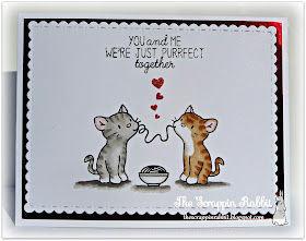 I stamped and embossed this cute little scene with the Mama Elephant Purrfect Pair stamps.  I colored up the kitties with my Copics. I added some metallic red sparkle to the hearts. The stitched layer is from the CDD Fancy Frames Dies;
